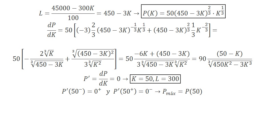 Se que mi restricción es 100L +300K= 45000, pero me he perdido en la parte de derivación y sustitución en las ecuaciones.