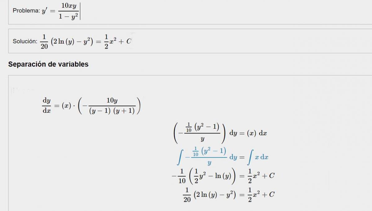 Hola... 10xy ý = 1-y^2 esta ecuación es del tipo ecuaciones diferenciales separables la respuesta del libro es 1- y^2 = c x ^ -1/5, espero que alguien sepa como llegar a ese resultado T-T ya tengo rato intentando.