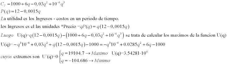 y me pide calcular el beneficio total, las cantidades que maximizan las utilidades y el precio de venta, si me pueden ayudar, el termino 10^-6.q³ en el costo total es el que me trae problemas.