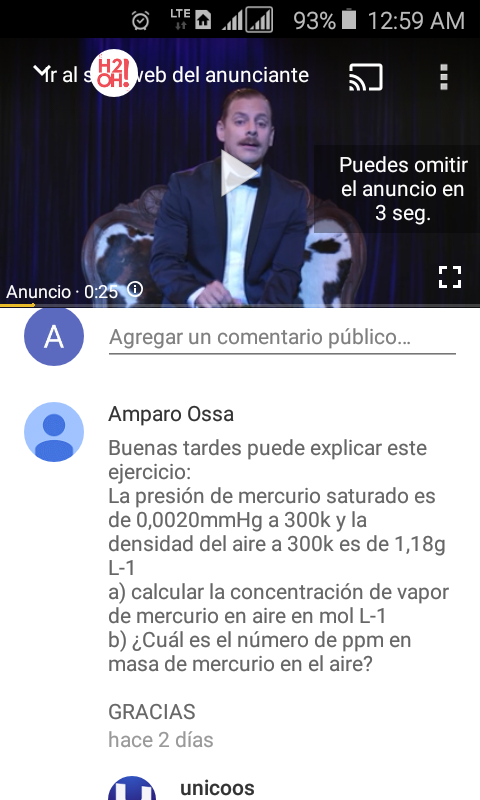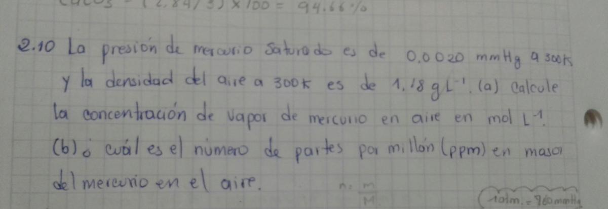 Hola buenas tardes en el canal de YouTube solicité una explicación de un ejercicio de gases, he intentado por todos los lados y no me sale. Intenté con la fórmula: P/RT=n/V pero como me están pidiendo la concentración de vapor de Hg no se como despejar la ley de los gases. Agradezco si me pueden ayudar tengo parcial de fisicoquímica el viernes.![]()