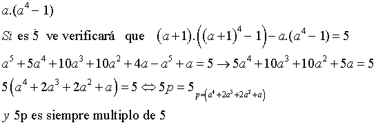 No es muy ortodoxa la demostración, pero ahí va: Escribo una tabla para las unidades de a, a2 +1 y a2 -1 puesto que a(a4 -1) = a(a2 +1)(a2 -1). Miro las unidades de los tres factores y las multiplico, obteniendo de ese modo las unidades de a.(a4 - 1) . Obsérvese que todas acaban en 0, por tanto a.(a4 - 1) es múltiplo de 5 para cualquier valor de a.