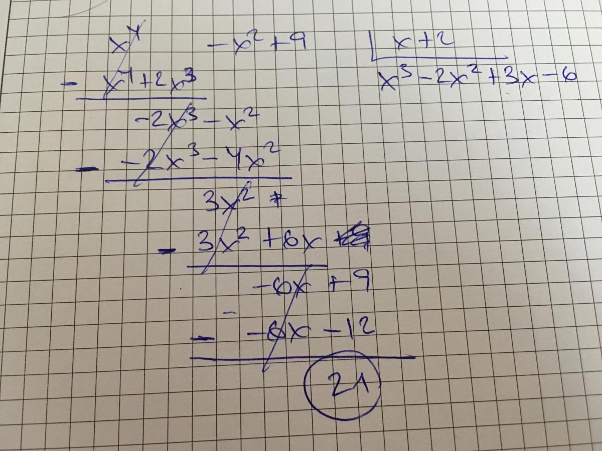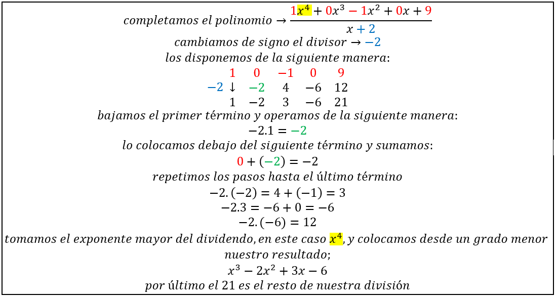 El ejercicio es este x4 -x2 +9 entre x+2 y hay que sacar el cociente de la división: