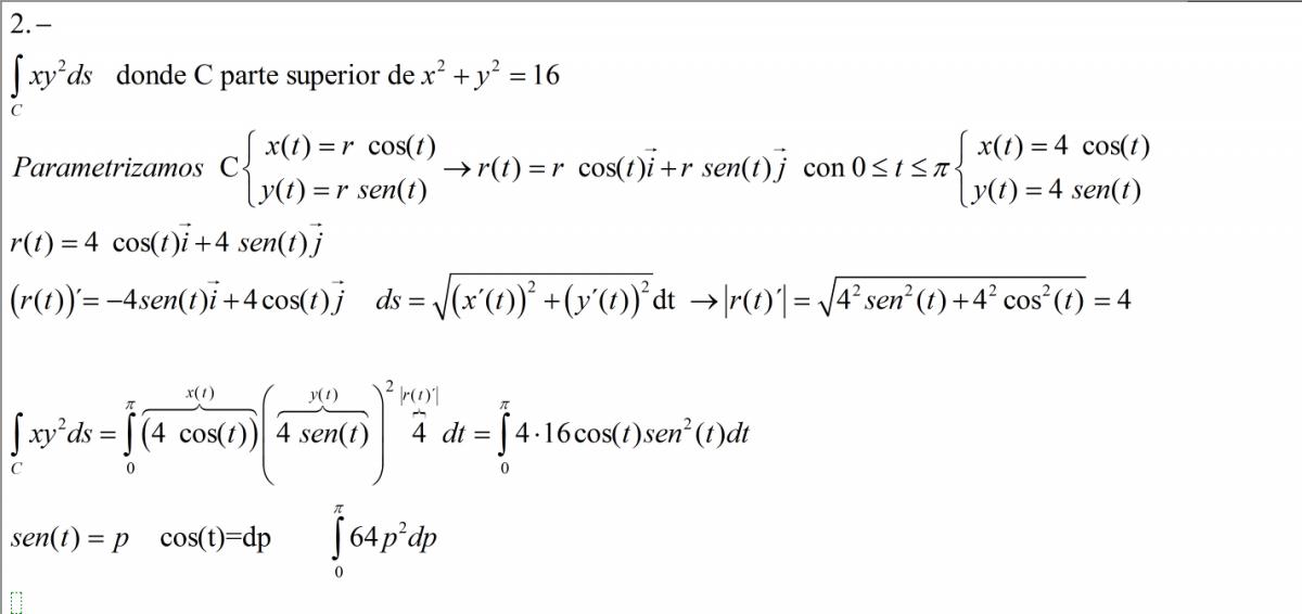 x = 2cost, y = 2sent, 0<=t<=pi, luego: dx = -2sentdt, dy = 2costdt,