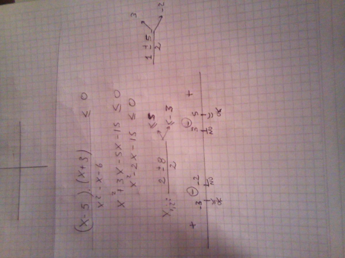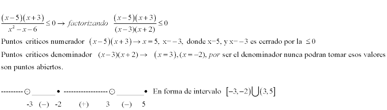 1) (x+2)(x-3) > 0, luego pasamos multiplicando en la desigualdad (observa que el denominador es positivo) y queda: (x-5)(x+3) <= 0.