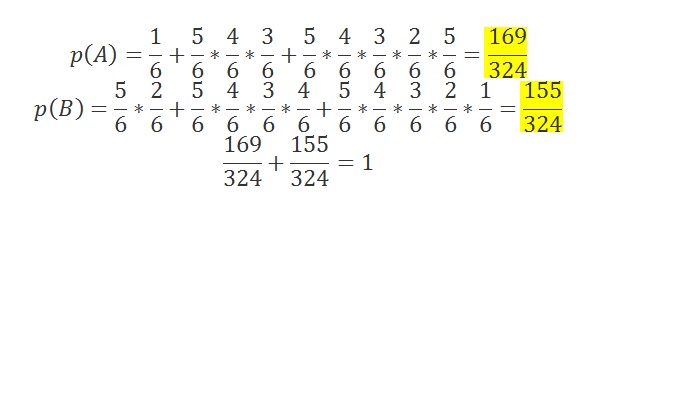 Los jugadores A y B juegan una secuencia de juegos independientes. Un jugador lanza un dado primero y gana con un "seis". Si falla, B lanza y gana con un "cinco" o seis ". Si no lo logra, A lanza y gana con cuatro, cinco o seis. Y así sucesivamente. Encontrar la probabilidad de cada jugador que gane la secuencia.
