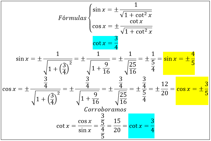 Observa que se trata de un sistema de dos ecuaciones con dos incógnitas que, al ser despejadas, conducirán a dos soluciones, ya que hay un ángulo del primer cuadrante que tiene cotangente +3/4, cuyo seno y su coseno son positivos, y hay otro ángulo en el tercer cuadrante, que también tiene cotangente +3/4, pero su seno y su coseno son ambos negativos.