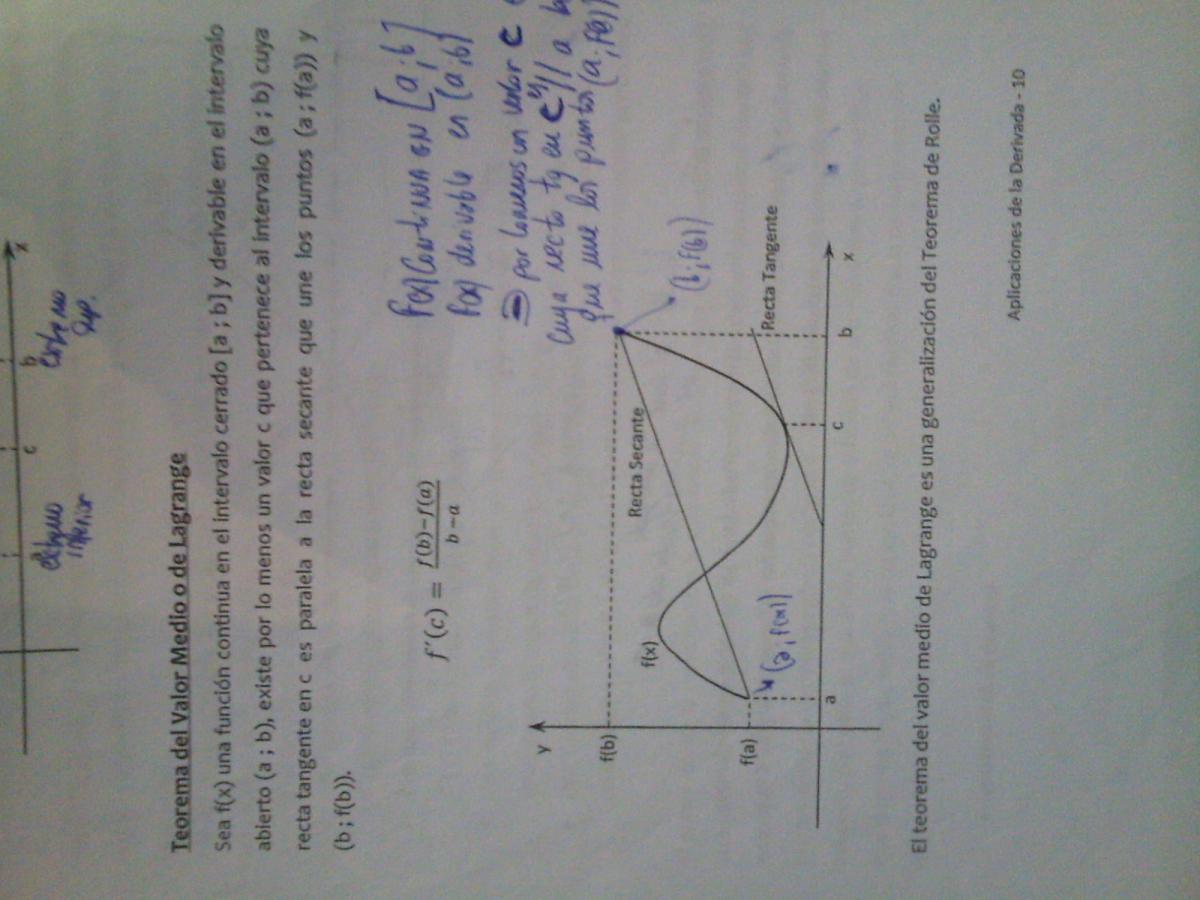 Sea la función f(x) : [a, b] --> IR , continua en todo el intervalo cerrado [a, b] y derivable en el intervalo abierto (a, b). Entonces existe un "C" en el intervalo [a, b], tal que f ' (C) = ( f(b) - f(a) ) / (b-a)