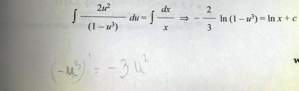 primero sacas la constante de la integral, en este caso el 2. Luego haces el cambio simple x=(1-u^3) y calculas dx, que es dx= -3u^2du entonces dx/-3 = u^2du, y sustituyes y verás que queda -2/3 por la integral. El razonamiento en general, consiste en calcular la derivada de lo de abajo y ver que falta arriba. Saludos.