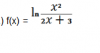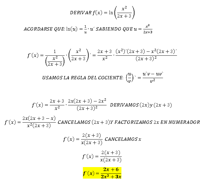 Hola, Juan. Recordemos que si tenemos una función derivable u y queremos derivar Ln(u), queda u'/u; por ejemplo, f(x) = ln(x), f'(x) = 1/x. Así, para derivar tu función habría que hacer u = (x^{2})/(2x+3). Observa que u es una función racional, del tipo P/Q, por lo que su derivada es (P'Q-Q'P)/Q^{2}. Espero que con estas pistas te salga. ;)