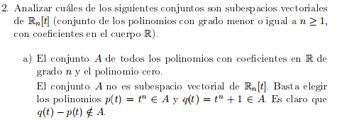 Para que un subconjunto sea subespacio vectorial se ha de cumplir que cualquier combinación lineal de elementos de él esté también en el. Esto incluye: