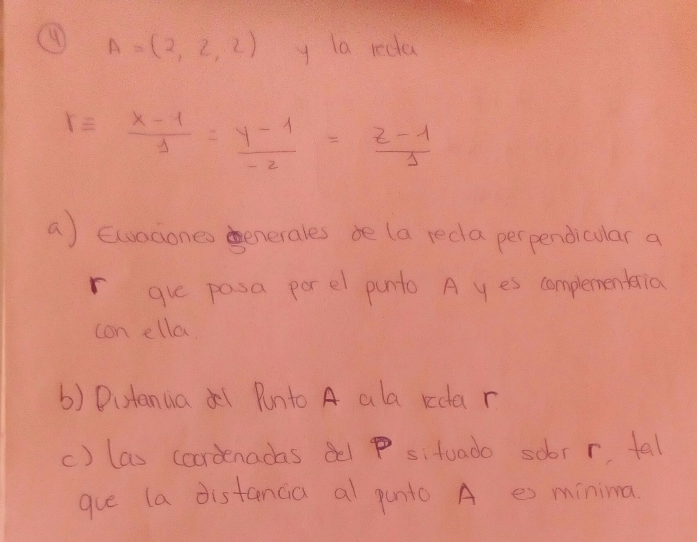 z=1+λ un vector que una el punto A con un punto genérico de la recta es (2-(1+λ),2-(1-2λ),2-(1+λ))=u=(1-λ),(1+2λ),(1-λ)