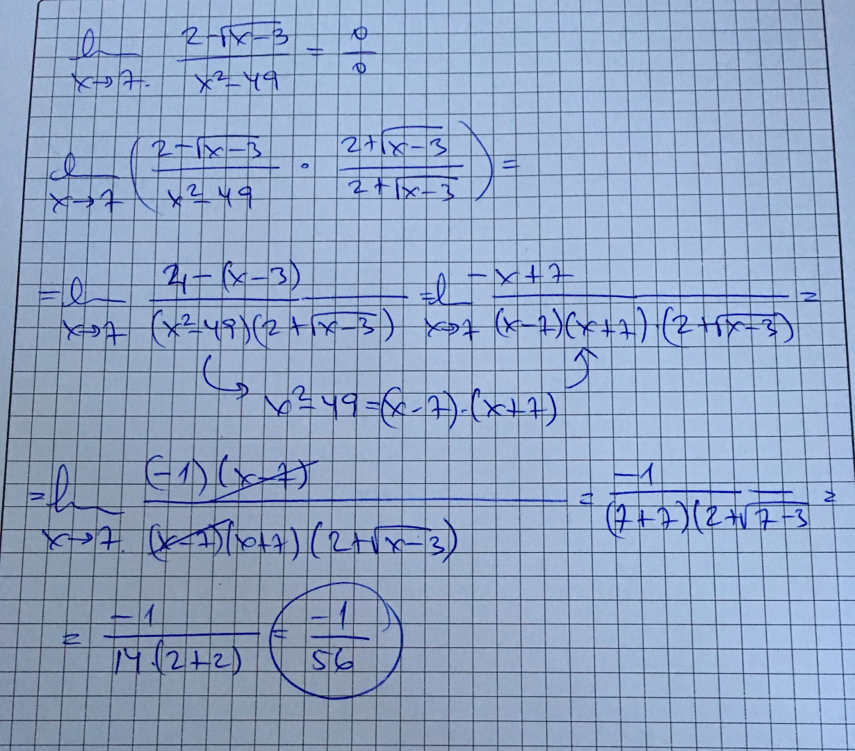 Hola! Me podéis ayudar con este límite porfa!! Lo he repetido racionalizando muchas veces y me da 0 mientras q la solución es -1/56. Gracias!