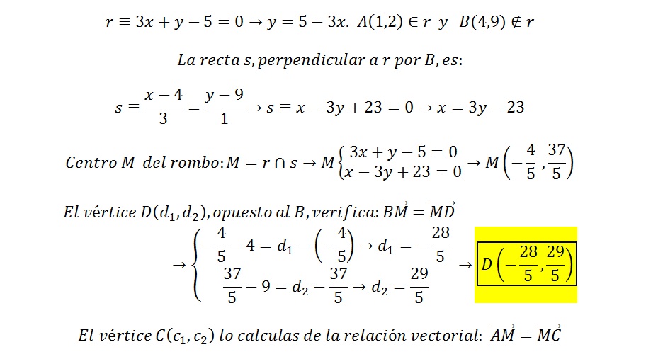 Un lado de un rombo está sobre la recta 3x+y-5=0 , sabiendo que los vértices opuestos del rombo son los puntos (1,2) y (4,9), calcula los otros vértices.
