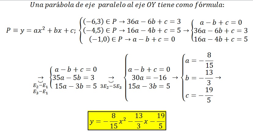Hallar la ecuación de la parábola de eje paralelo al eje Y y que pasa por los puntos (-6,3),(-4,5),(-1,0).