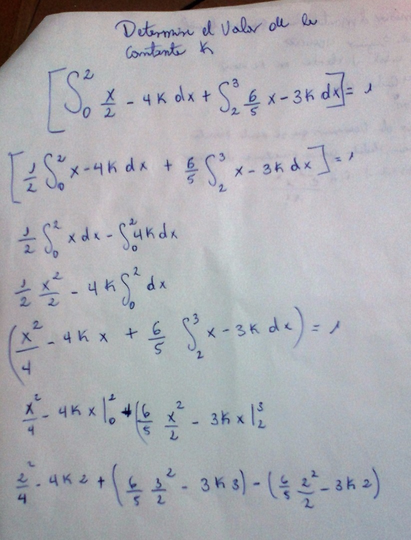 I1 = [ (1/4)x^2 - 4kx] = (evaluamos con regla de Barrow entre 0 y 2) = (1 - 8k) - (0 - 0) = 1 - 8k.
