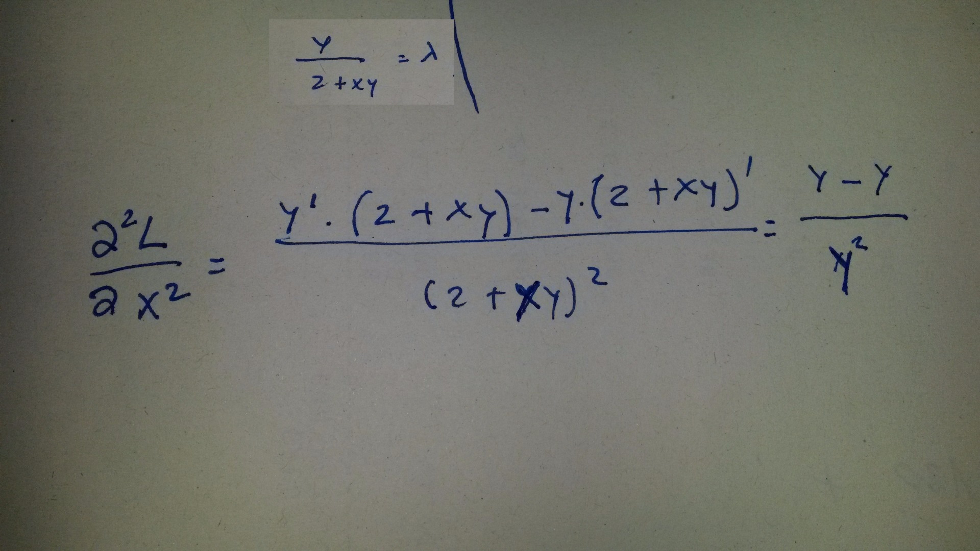 La derivada con respecto a x de 2+xy es x.y'.... La primera derivada parcial te quedará [y'(2+xy) - y.x.y'] / (2+xy)² = [2y' + xyy'-xyy']] / (2+xy)² = 2y' / (2+xy)²