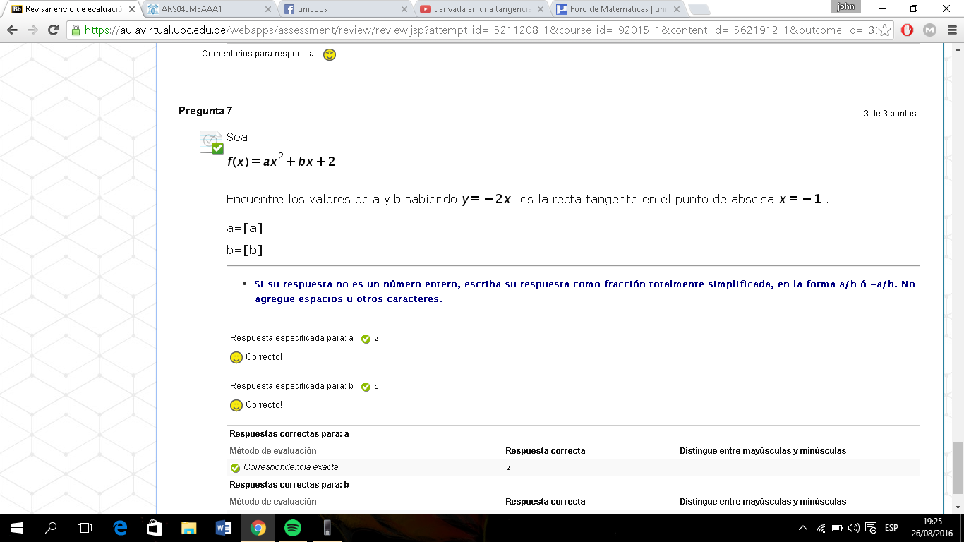 f(-1) = 2, que al reemplazar en la expresión de la función queda: 1-a + b = 2, y luego de hacer pasaje de término y resolver queda: