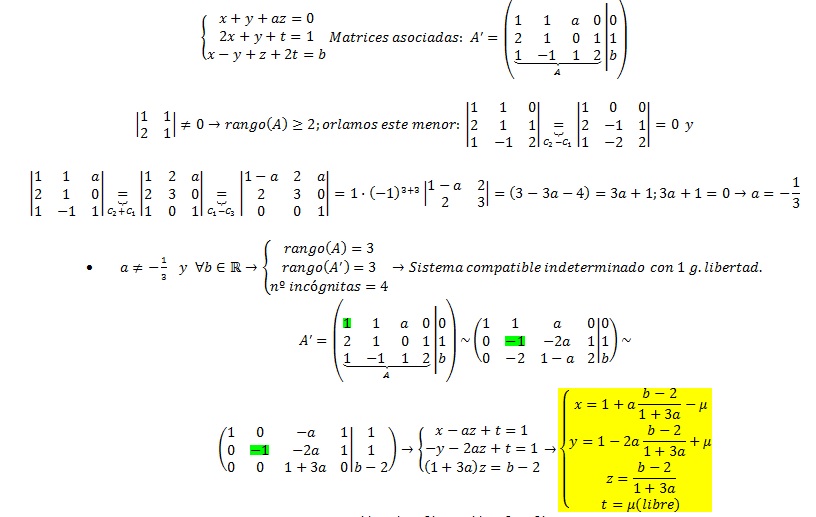 Ejer: Clasificar y resolver el siguiente sistema de ecuaciones en función de los parámetros a y b;