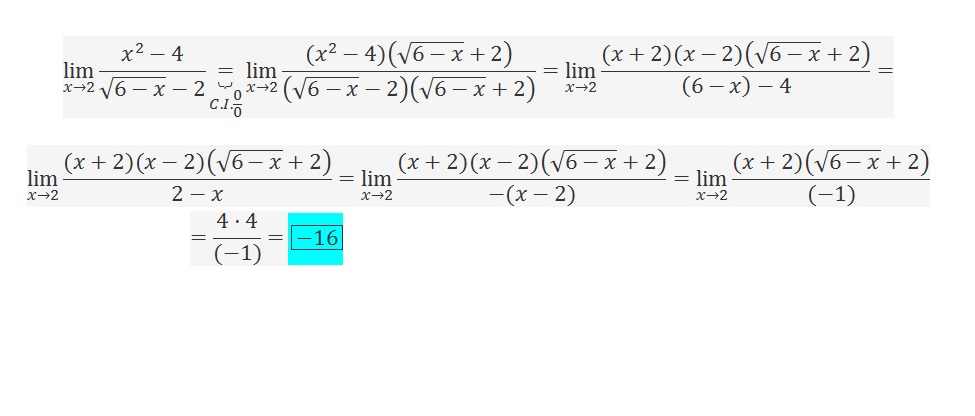 Holaa, estoy dando los límites y me dan lim x-2 de (x^2 -4/ (√6-x) -2) y no se como despejar la raíz (solo está dentro de esta el 6-x) elevó todo el denominador al cuadrado para despejar? Pero cuando tenga x es el resultado final del de abajo?