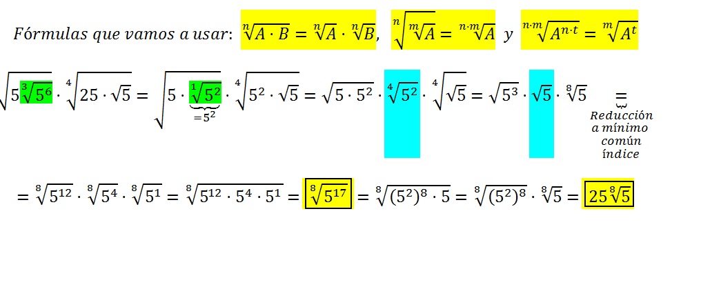 observa que podemos simplificar en el segundo factor y en el tercero, y que podemos multiplicar los índices de las raíces ya que tenemos una raíz cuarta cuyo argumento es una raíz cuadrada, lo hacemos y queda: