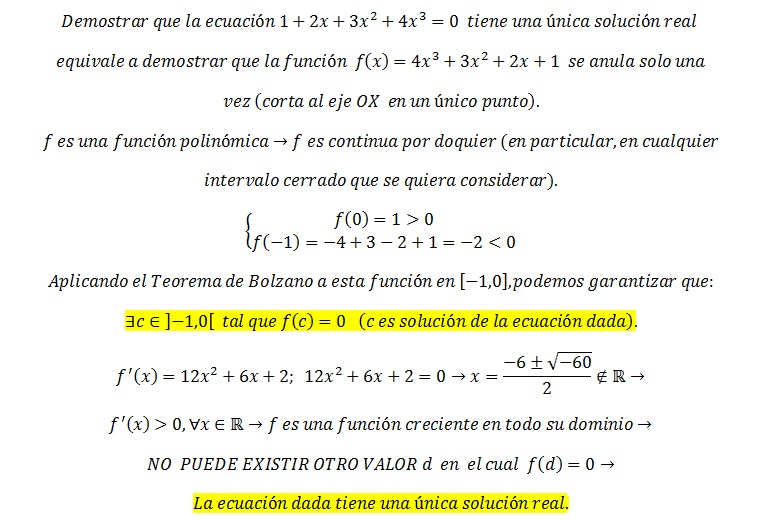 Demostrar que la ecuación 1 +2x + 3x^2 + 4x^3 = 0 tiene una única solución real y localizar un intervalo de longitud 1 que la contenga