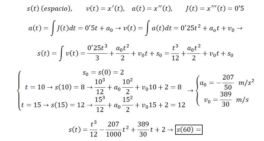 "Podemos definir la sacudida como la derivada de la aceleración con respecto al tiempo. Si la sacudida de una partícula viene dada por J(t): 0.5 m/s^3 , encuentre la posición luego de haber transcurrido un minuto, si se sabe que su posición inicial es 2mt, luego de 10 segundos se encuentra 8 mt, y 5 segundos después ha avanzado 4 mt más"
