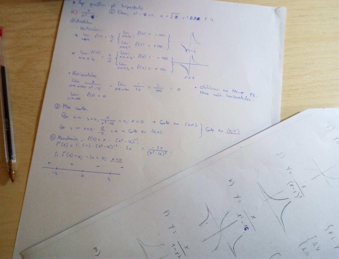 Hola, no encuentro el error. Debería darme algo como lo que se ve abajo a la derecha en el dibujo, pero la monotonía me sale diferente. He repasado la derivada varias veces y no sé qué estoy haciendo mal. Es el apartado k). A ver si alguien me dice donde meto la pata, por favor. La función es f(x) = (x) / (x^2-16), por si no se ve. El problema es la monotonía, el resto está bien.