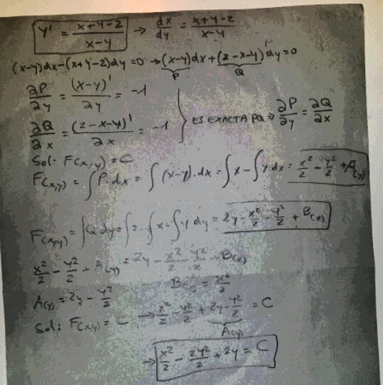 Integral P*dx = Integral (y - x)dx = (observa que y es constante) = yx - (1/2)x^2 + A(y)