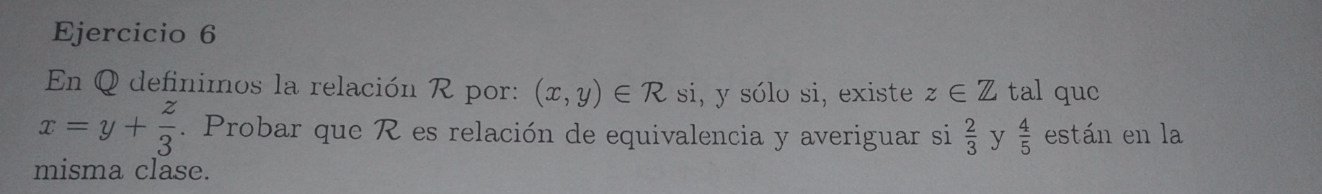 -2/5 = z, que no pertenece al conjunto de los números enteros, por lo tanto tenemos que 2/3 y 4/5 pertenecen a clases de equivalencia diferentes.