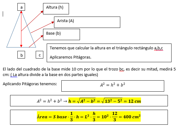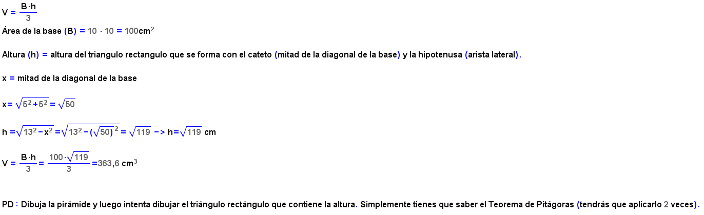 Hola a tod@s. Como hallo el volumen de una pirámide de base cuadrada con 10 cm por lado y una arista lateral de 13 cm ?
