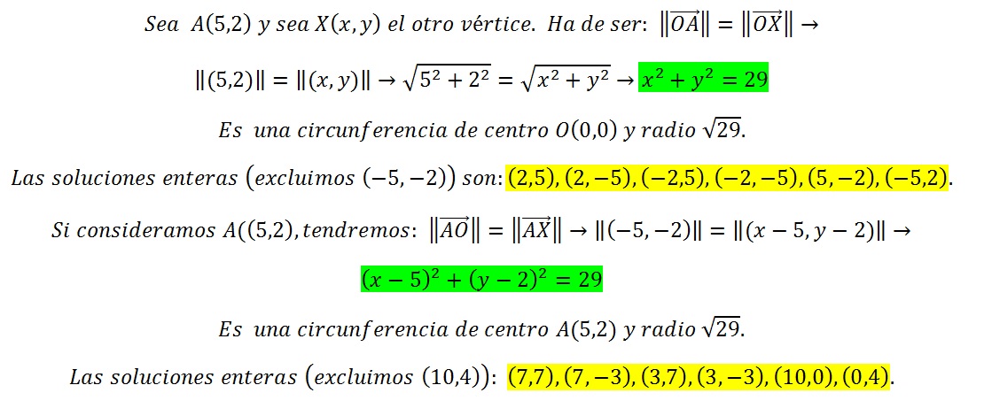 Dos vértices de un triangulo isósceles se encuentran en (0,0) y (5,2). Si el segmento comprendido entre estos puntos, es uno de los lados iguales del triángulo, determina todas las posibilidades de números enteros para el tercer vértice.