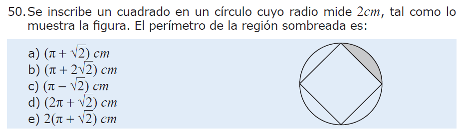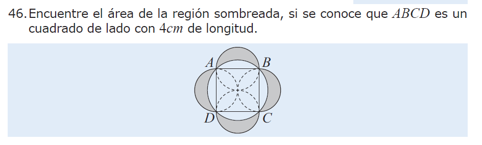 Calculamos el área del círculo interior sin sombrear, para lo que hay que calcular la diagonal del cuadrado y dividirla por dos para obtener el radio de dicho círculo:4
