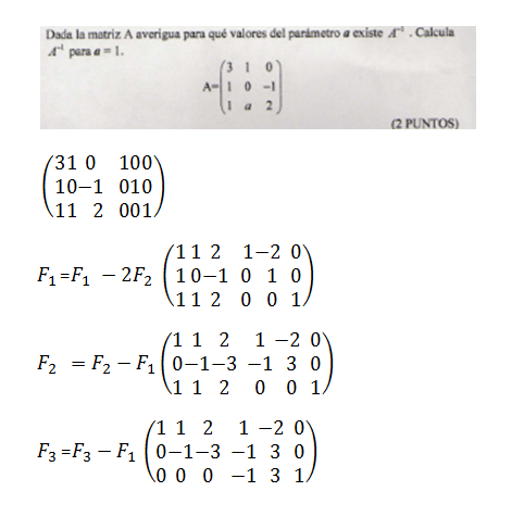Hola unicoos, necesito ayuda con esta matriz inversa, en la tercera fila me sale tres ceros y ya no se como seguir. Gracias