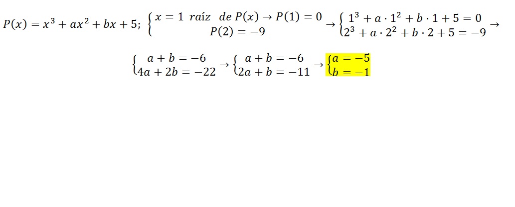 hola buenas ,tengo dudas sobre polinomios me tranco y no se como seguir ej: me pone hallar ayb bien luego admite raiz 1 y que P(2) = -9 .hago por sustitucion pero no se como seguir . necesito ayuda porfiss P(X)= x alcubo+ax ala dos+bx+5