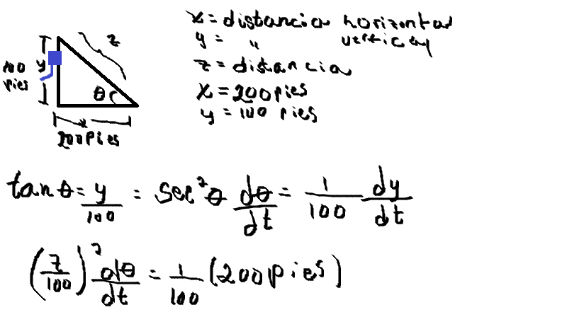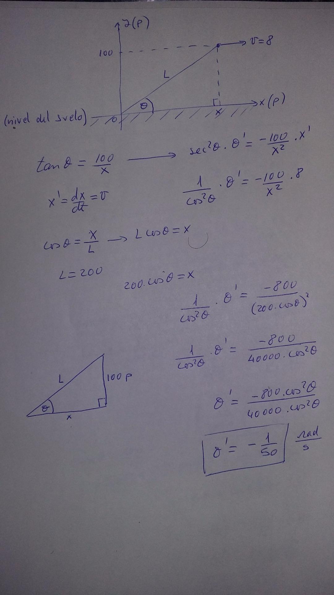 una cometa a 100 pies sobre el suelo se mueve horizontalmente con una velocidad de 8 pies/s ¿con que velocidad cambia el angulo formado por el hilo y la horizontal, cuando se ha soltado 200 pies de hilo?