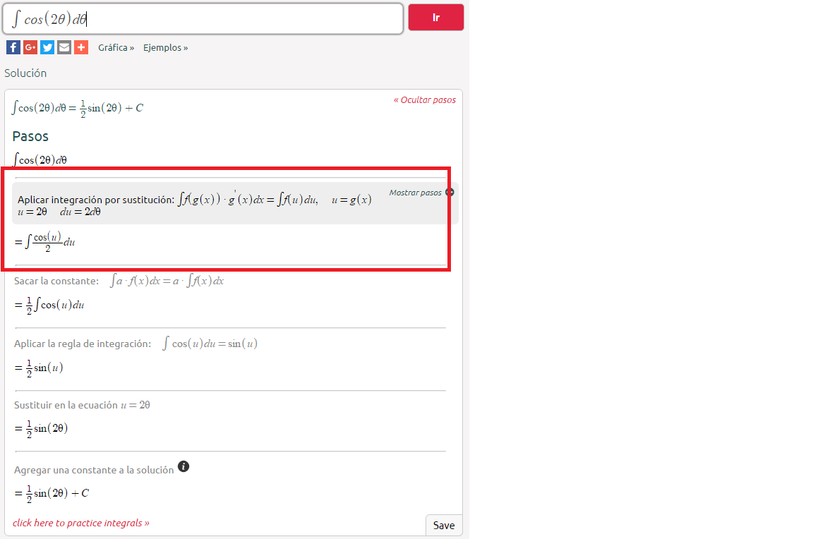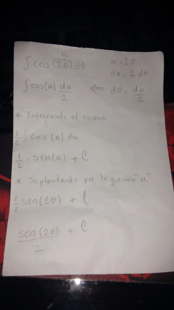 Alguien me puede explicar porque en la parte de rojo queda cos(u)du sobre 2, no entiendo porque queda sobre 2 despues de aplicar integracion por sustitucion