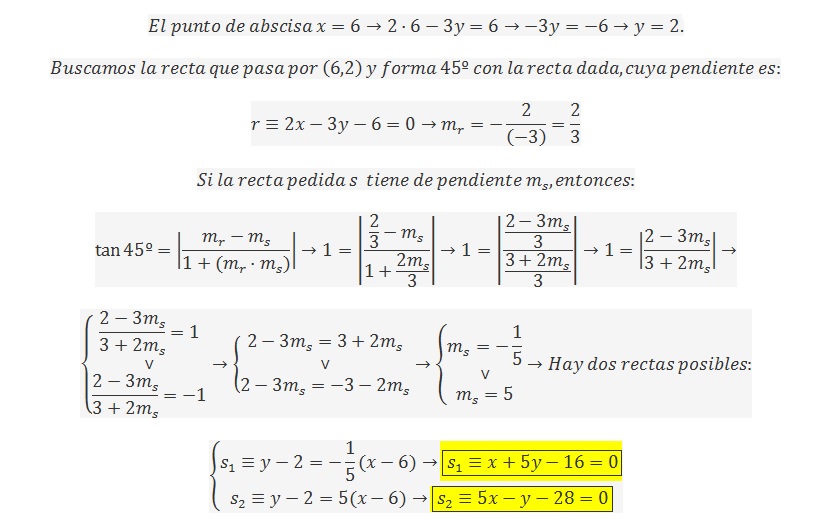 Calcula la recta que corta a la 2x-3y=6 en el punto de abcisa 6 y además forma un ángulo de 45º con ella.