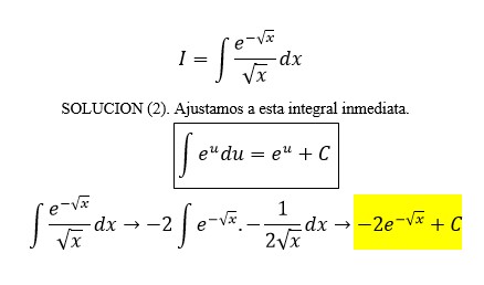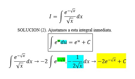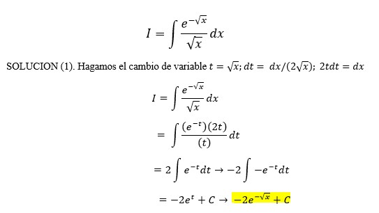 La integral e^-√x/√x la resuelvo por el método de integracion por partes, pero me queda al final como resultado e^-√x . 2 . - e^-√x