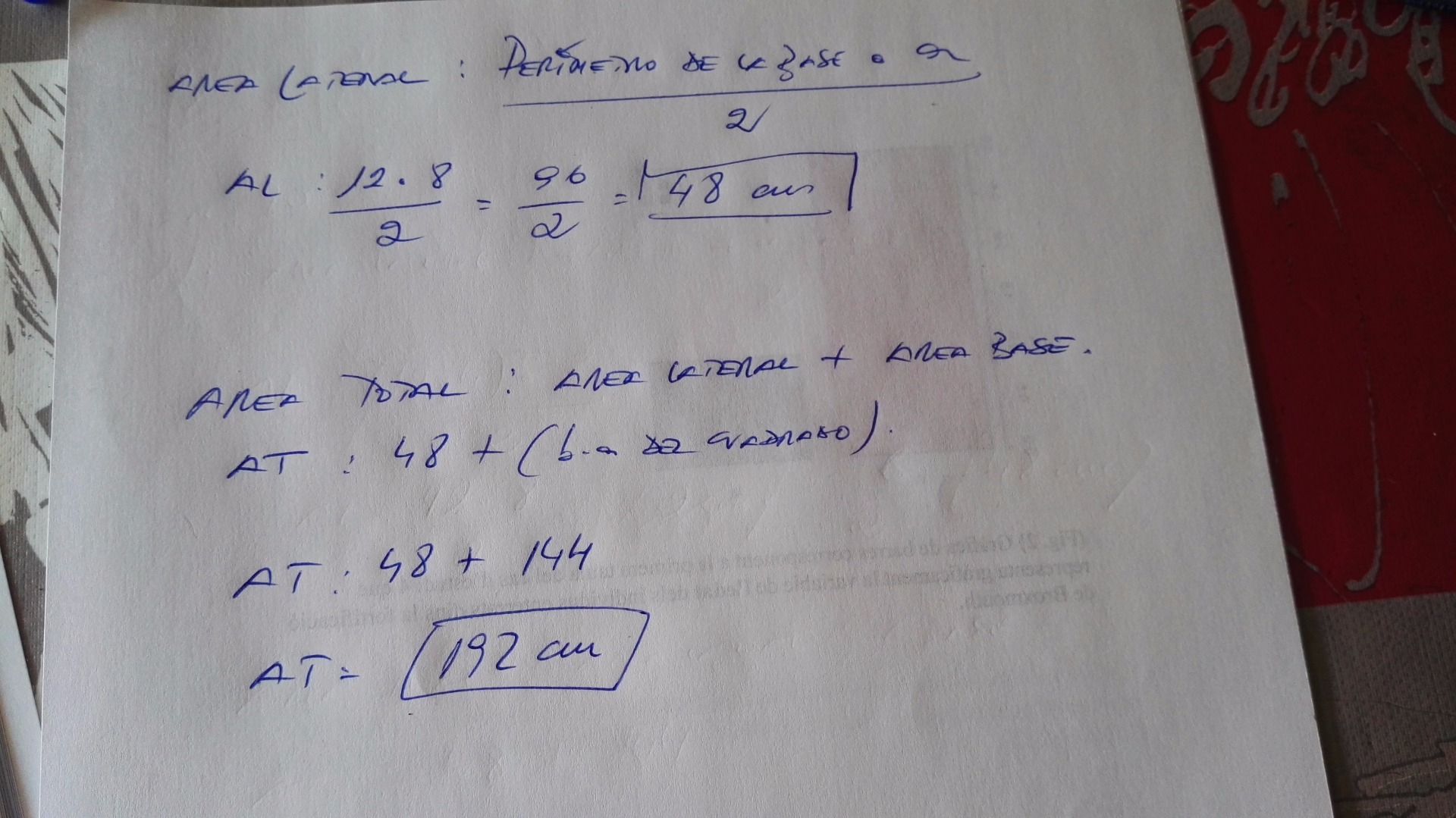 área lateral total = 240 + 144 = 384 (en cm^2).