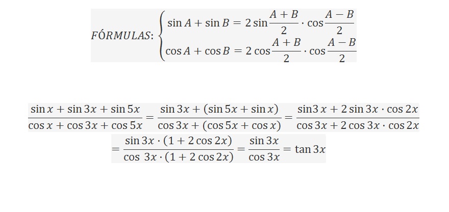 (sen(x)+sen(3x)+sen(5x))/(cos(x)+cos(3x)+cos(5x))=tan(3x)