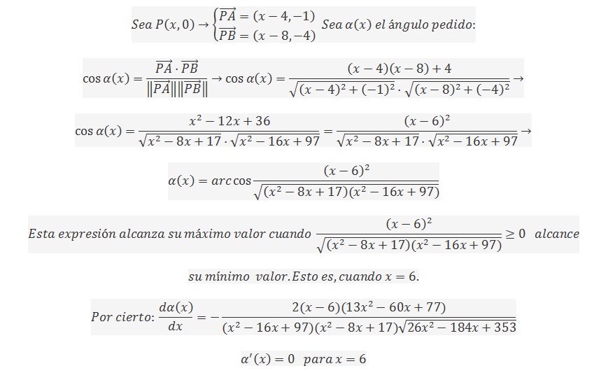 Dados los puntos A(4 ; 1) y B(8 ; 4) encuentre abscisa de P sobre el eje x para que el ángulo APB sea máximo.