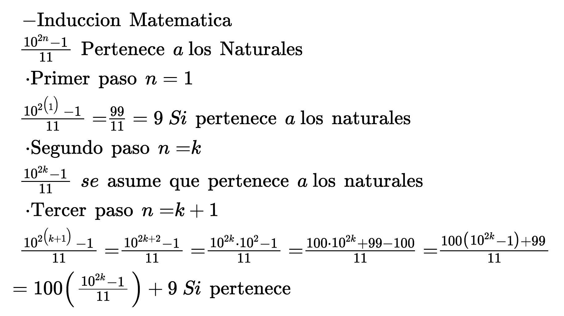 Hola hicos tuve problemas con este ejercicio, me podrian ayudar?? Graciass. Probar que 10^2n -1 es divisible por 11 cualquiera sea n ε N. ( 2n esta elevado )