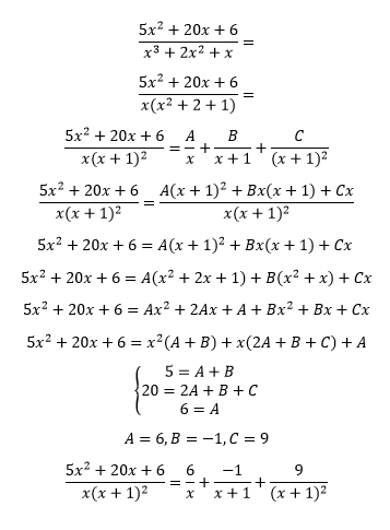 En la cuarta linea hice el Minimo Comun Multiplo, resolviendo esa suma de fracciones como (x+1) esta presente en "(x+1) al cuadrado" solo se escoge el mayor, despues de la cuarta linea a la quinta ambos lados de la igualdad multiplique por el denominador para que se simplifiquen en ambos lados, luego segui resolviendo he hice igualdad de polinomios lo que va alado de la x cuadrada es igual a lo que va alado de la x cuadrada lo que va alado de la x es igual a lo que va al lado de la x y asi, espero poder ayudarte. Suerte :)