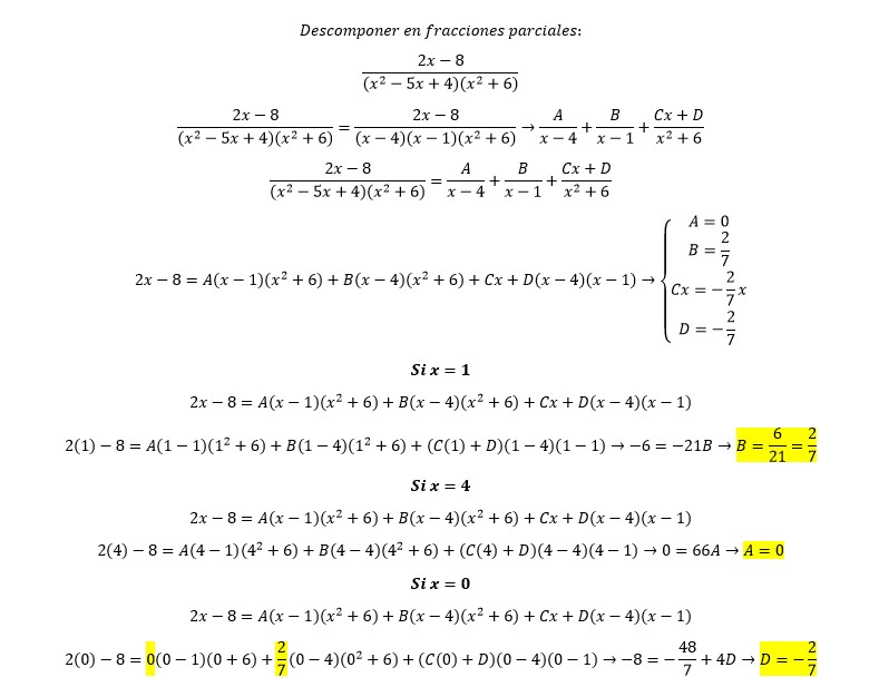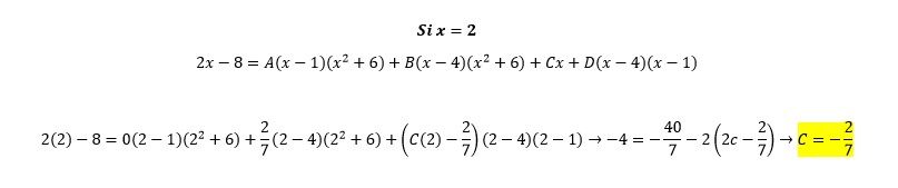 A / (x-4) + B / (x-1) + C/ (x²+6) creo que ya estoy mal porque en el libro viene 4 resultados