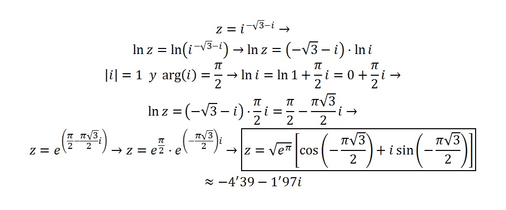 Ln(z) = (-V(3) - i) * Ln(i) (observa que hemos empleado la propiedad del logaritmo de una potencia)