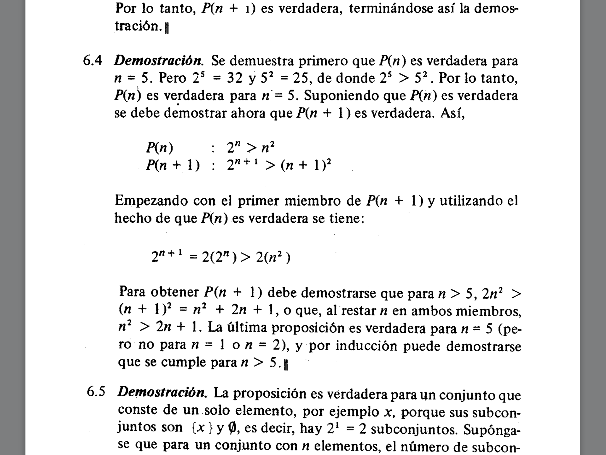 Hola! Mi duda es concreta: en esta demostración (6.4. demostrar por inducción que para cada entero n≥5, 2^n>n^2) no entiendo por qué debe cumplirse que 2n^2>(n+1)^2...Muchas gracias de antemano!! :)