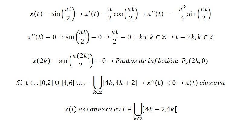 me piden determinar los puntos de inflexión y los intervalos de concavidad y convexidad de la función x(t)= sen (π/2 t). Gráfica señalando los puntos de inflexión y los intervalos