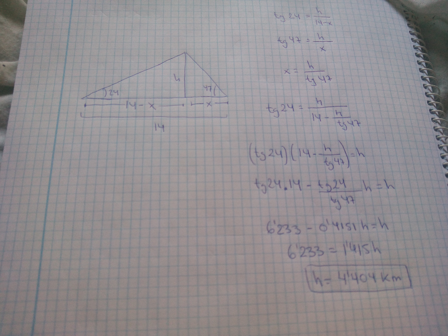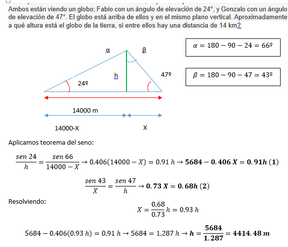 Fabio y Gonzalo están en una carretera recta, separados por una distancia de 14 kilómetros. Ambos están viendo un globo; Fabio con un ángulo de elevación de 24°, y Gonzalo con un ángulo de elevación de 47°. El globo esta arriba de ellos y entre ellos, en el mismo plano vertical. Aproximadamente a que altura esta el globo de la tierra?