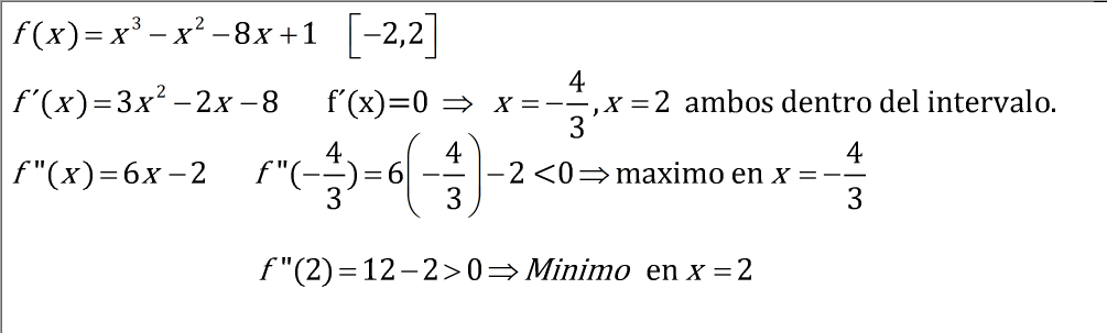 Luego analize la función derivada en los extremos del intervalo, y me quedó: f´(2)= 3.(-2)^2-2(-2)-8=-2 . Por lo tanto -2 no es un punto crítico
