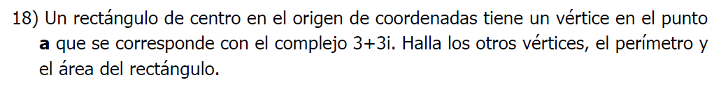 Por lo tanto, te han dado datos suficientes para trazar media diagonal, que es el segmento que une el origen (0,0) con el punto representativo del número complejo dato, que es a(3,3), luego extiendes el segmento guardando simetría con el origen, y obtienes el segundo punto que es c(-3,-3) (observa que el punto c representa al opuesto del complejo dato).